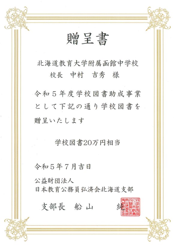 ?R5年度「教育文化事業」の一環として学校図書が本校図書室に寄贈されました。※学校図書贈呈書(82.89 KB)