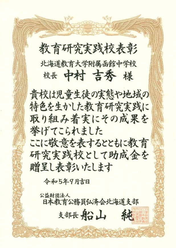 ?R5年度「教育研究助成事業」の一環として助成を受けるとともに、教育実践に継続して取り組んできた実績を認められ「教育研究実践校」として表彰されました。※表彰の様子はこちら ※表彰状(158.87 KB)